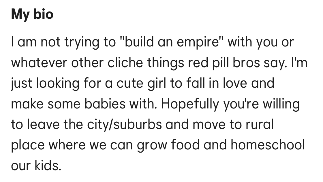 There’s a woman on TikTok who is publicly ruminating about the possibility of building a dating app solely based on matching with people who share your political affiliation. Dating apps unsurprisingly have a filter for politics. Many go so far as to call out this dealbreaker on their profiles more obviously, like this guy, whose primary profile picture I've cleverly disguised to protect his identity while still illustrating my point: