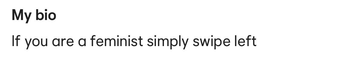 Profile is entirely negative e.g. “no x type of women” or “if you’re x swipe left” (reason: appears close-minded or judgmental)
