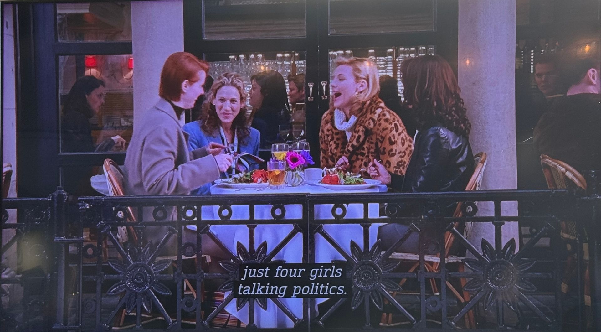At one of their ubiquitous girl brunches, the four women get into a semi-comedic debate about their own voting records (Carrie isn’t even registered), who they vote for (Charlotte: whoever reminds her of her father), and what qualities are most important in a political candidate (Samantha: a man who is f*ckable, so he isn’t tempted to f*ck the country).