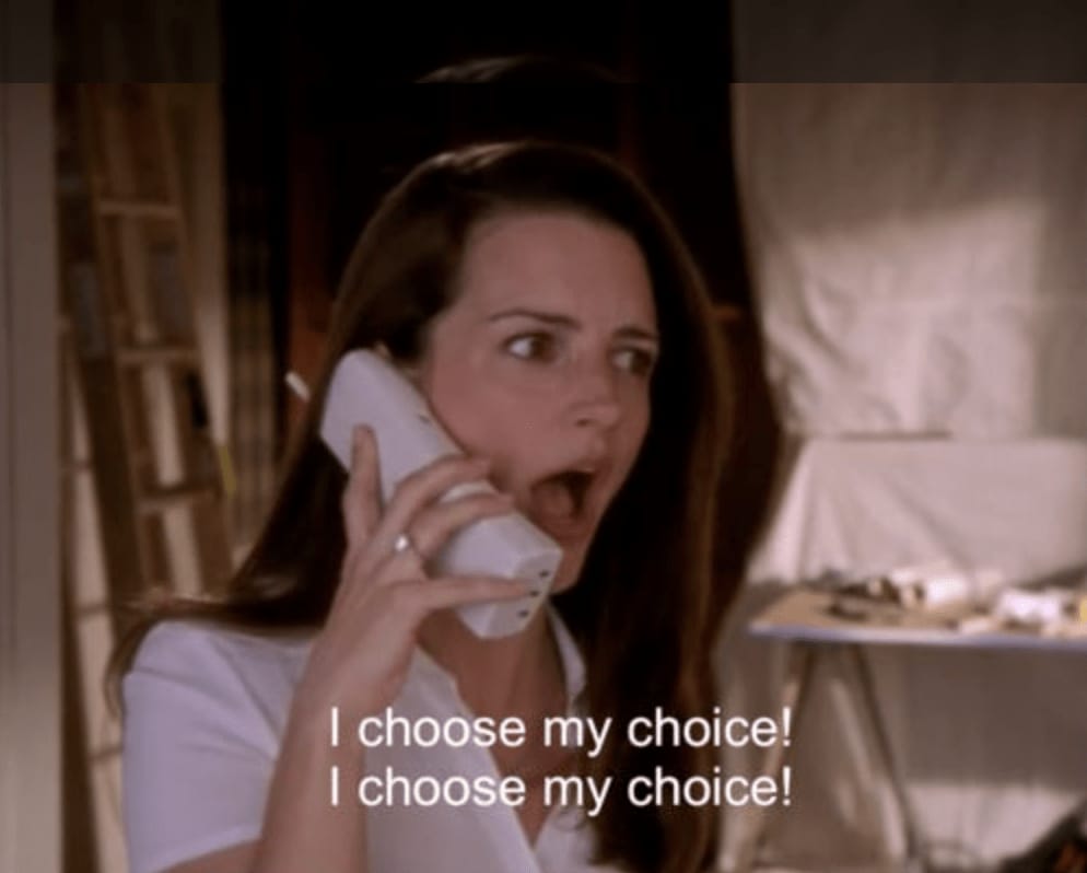 Not to always be quoting Sex and the City, but this makes me remember the episode where Charlotte decides to quit her job when she and Trey are trying to get pregnant. She accuses Miranda of being judgemental of her decision, declaring that “the women’s movement is about CHOICE”: