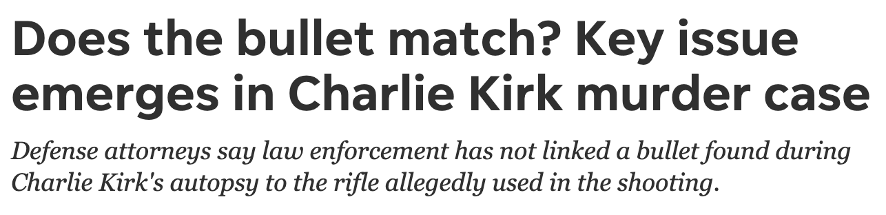 The bullet recovered from Charlie Kirk’s body broke on impact, resulting in it being badly damaged by his bones. This means that only a fragment of bullet was recovered, which immediately complicates any attempts to “match” the bullet to the gun that fired it. This does NOT mean that the bullet was conclusively not fired from the gun found at the scene (that was wrapped in a towel that contained the alleged assassin’s DNA). It similarly does NOT mean that it was fired from that gun either.