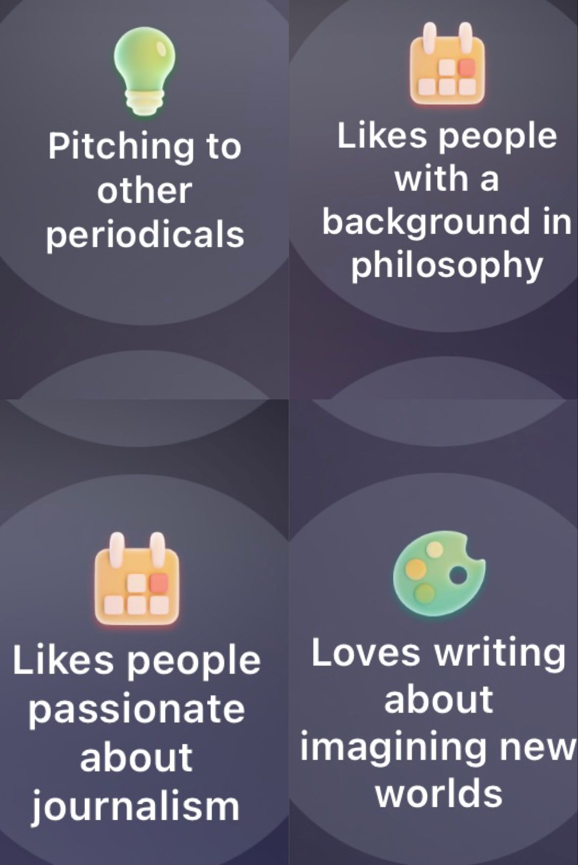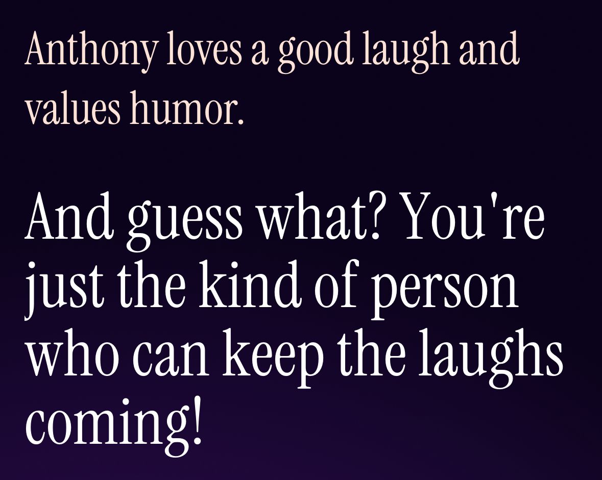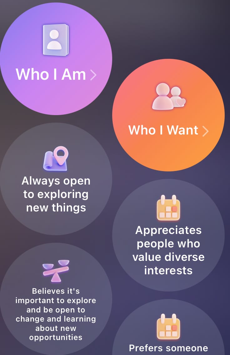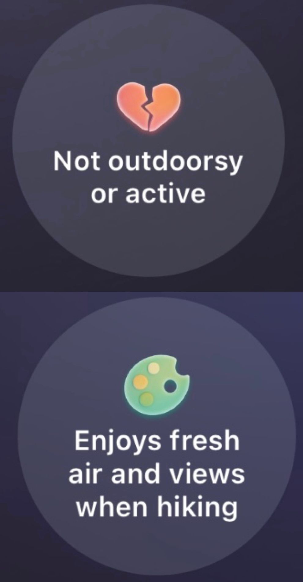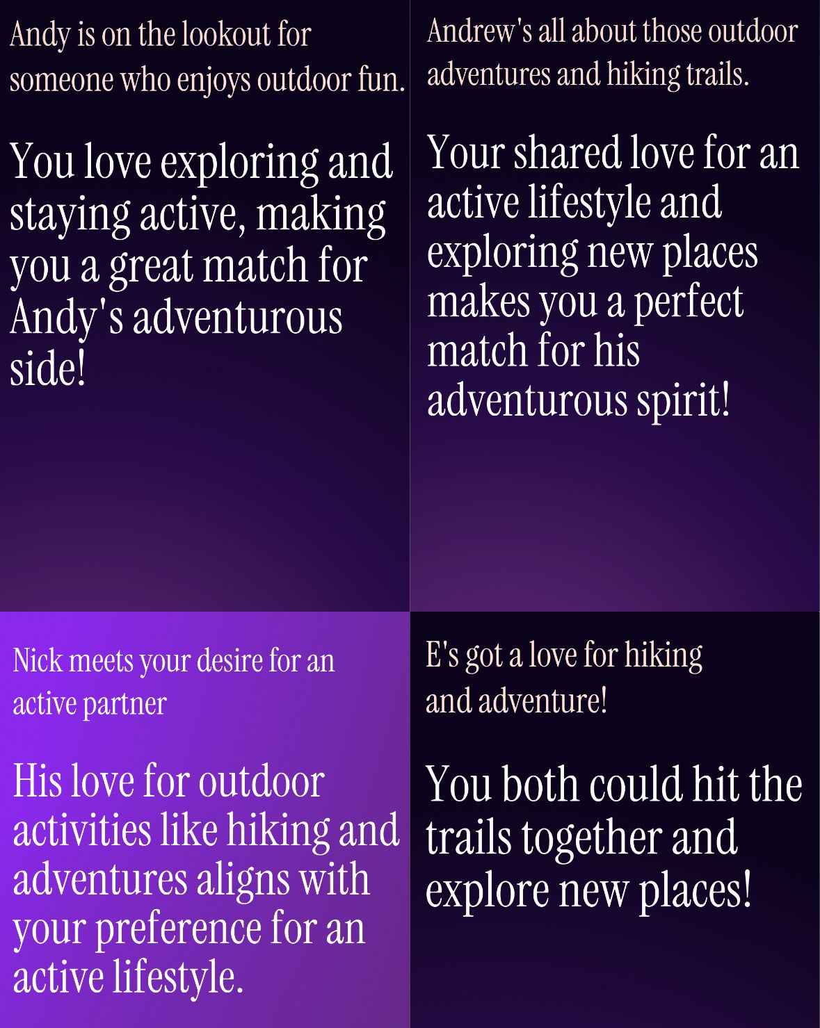 It’s pretty clear what’s going on here. I’m sure I said something along the lines of “I enjoy a hike once in a while” (just like I said above, lol) but I am not outdoorsy. She probably asked what I enjoy when I hike and I said “fresh air and views” — and this is where we landed. She’s defined me as both NOT outdoorsy (true), NOT active (at least partially false), but also as someone who enjoys parts of hiking like fresh air and views. In and of itself that isn’t terrible. After all, humans contain multitudes that are often conflicting. But the fact that she then highlighted this quality in a contradictory way in four successive matches demonstrates how poorly this particular brand of AI is doing at adding any real value to the dating experience.